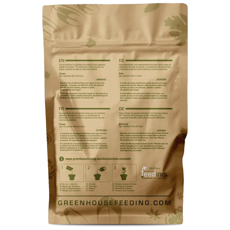 BioGrow is an ‘all-in-ONE’ blend of carefully selected natural materials, formulated specifically for the vegetative growth stage of fast growing plants. Essential nutrients are provided for superior growth, both readily available for the plant and slowly releasing to supply all nutrients over a period of 8 weeks. During vegetative growth, plants require higher amounts of Nitrogen. Nitrogen makes the cells divide and multiply, which is the reason that plants need higher amounts of it during the vegetative growth stage when leaf and root development is at its peak.