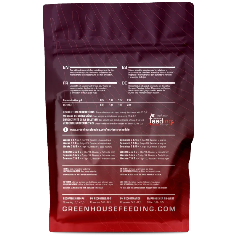 Our Booster contains not only Phosphorus (P) and Potassium (K) but also extra Magnesium (Mg) and trace elements to ensure the nutrient content is balanced and there is no lack of any element that might limit the uptake of others.