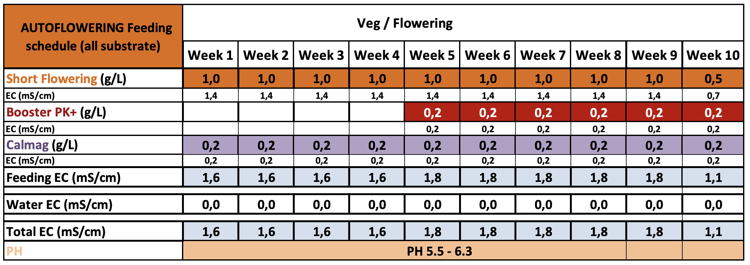 The GHF Autoflower Starterkit is a combination of our GHF Shortflowering, especially design for strain with short flowering time from indica to autoflowering strains, our GHF Calmag to correct Calcium and Magnesium deficiencies and to have the best possible flowers, we add our GHF Booster PK+, together it makes the perfect match for any autoflowering strains!